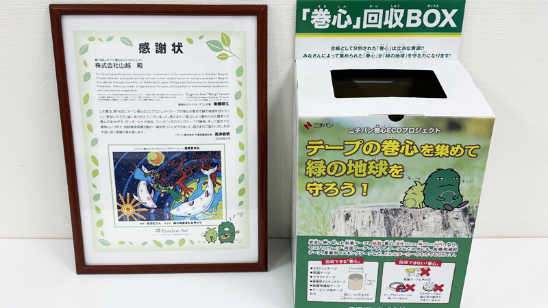 弊社は、ニチバン株式会社が推進する「巻き芯回収プロジェクト」に参加しています。使用済みのセロテープやガムテープなどの巻き芯を回収・再資源化することで、廃棄物の削減と資源の有効活用に貢献しています。印刷業として環境への責任を果たすため、日々の業務の中でもできることから取り組んでいます。