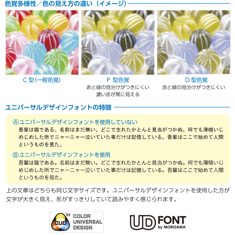 誰もが見やすく、使いやすいコンテンツを提供するため、MUD(メディア ユニバーサル デザイン)対応製品のサービスを展開しています。色の見え方や文字の読みやすさなど、さまざまな視点から配慮されたデザインを取り入れ、情報の伝わりやすさを追求しています。